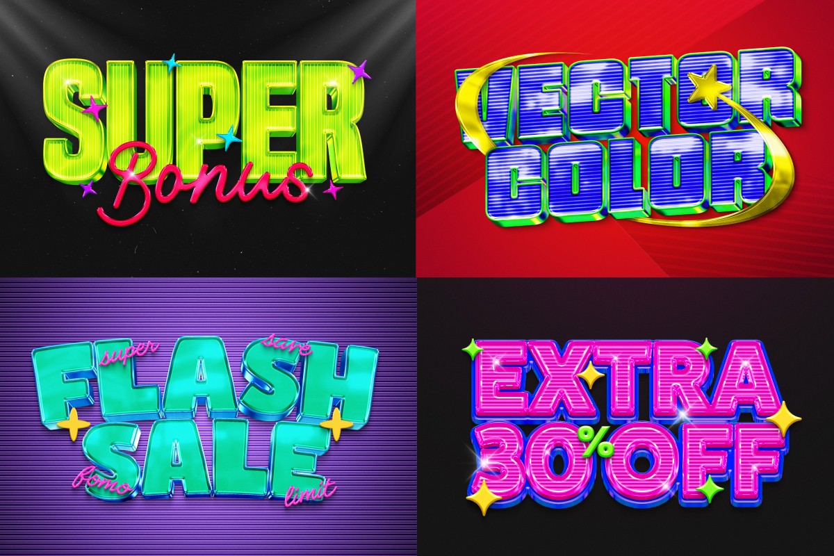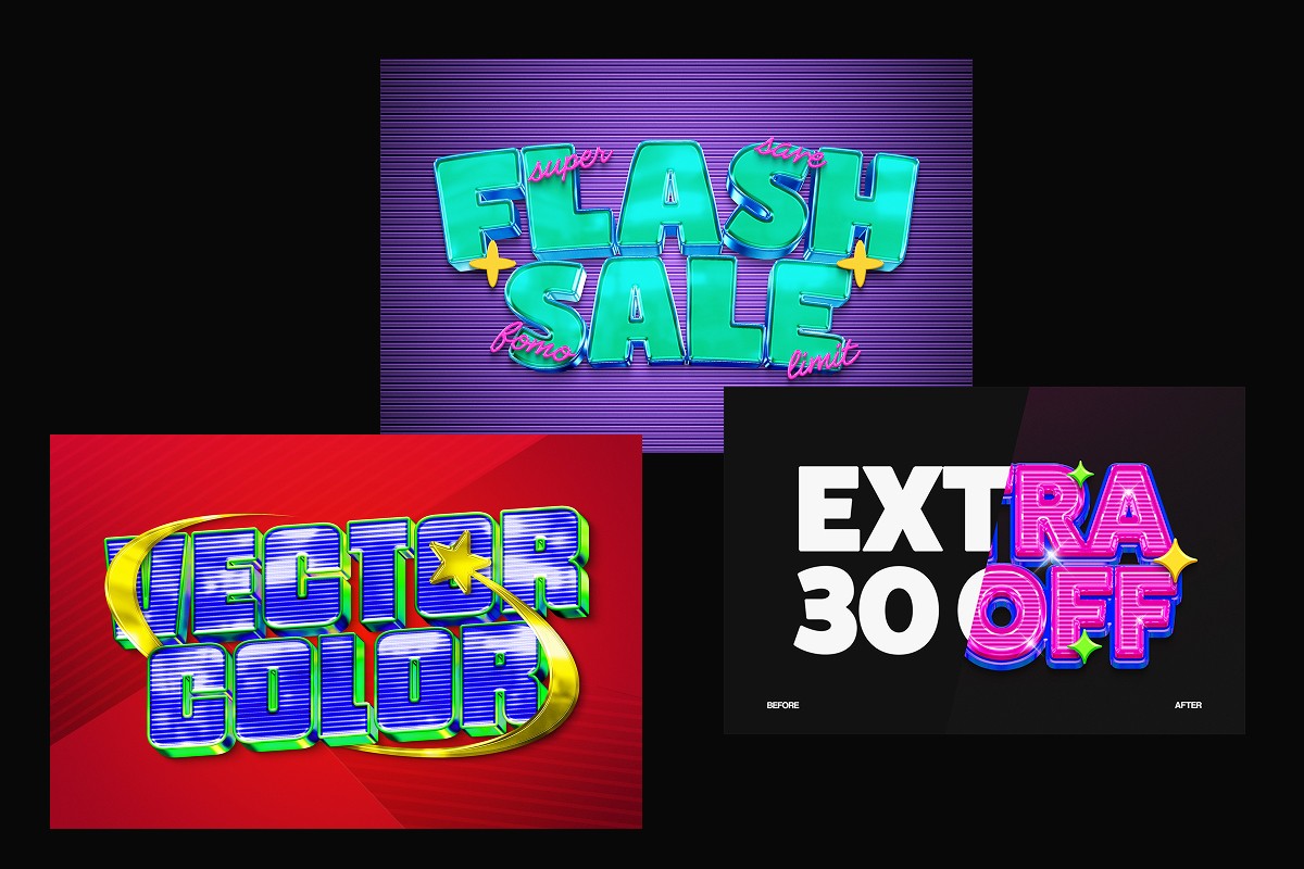 3D sale promotion text effects featuring bold typography, vibrant gradients, glossy depth, and high-impact marketing style. Designed to create attention-grabbing headlines for discounts, offers, and promotional campaigns.