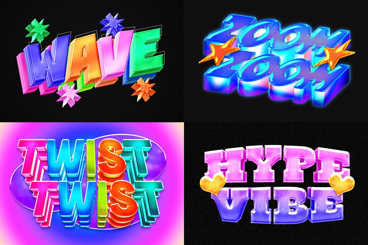 Colorful 3D glossy text effects featuring vibrant gradient tones, smooth plastic shine, bold depth, and playful modern styling. Designed to create eye-catching titles with energetic Y2K-inspired aesthetics and dynamic visual impact.