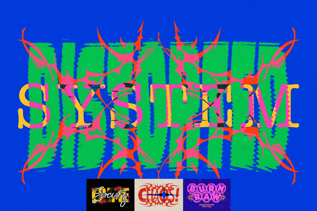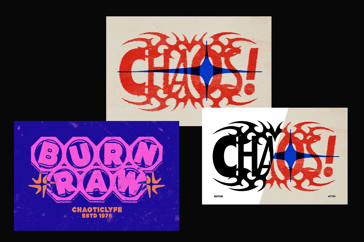 Grunge overprint text effects featuring rough textures, spray print details, distressed typography, and experimental layered visuals. Designed to create bold typographic compositions with a raw, underground aesthetic.