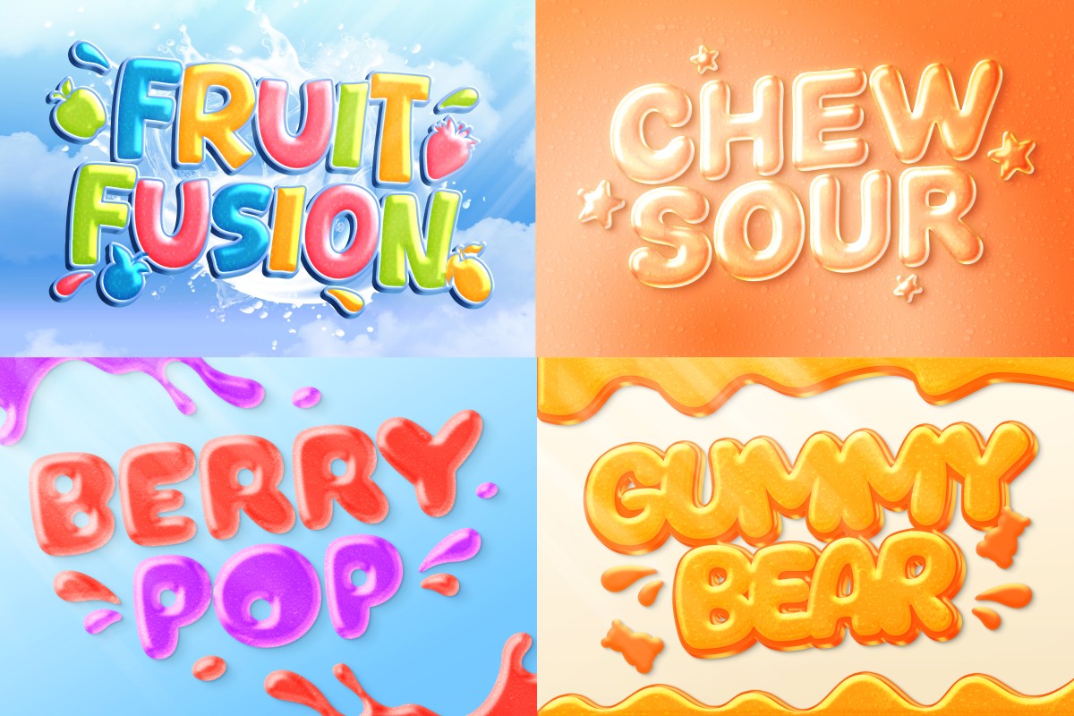 Candy gummy 3D text effects pack featuring glossy, chewy, fruity, and soft jelly-style typography. Designed with vibrant colors, smooth highlights, and delicious-looking textures to create playful and eye-catching text designs.