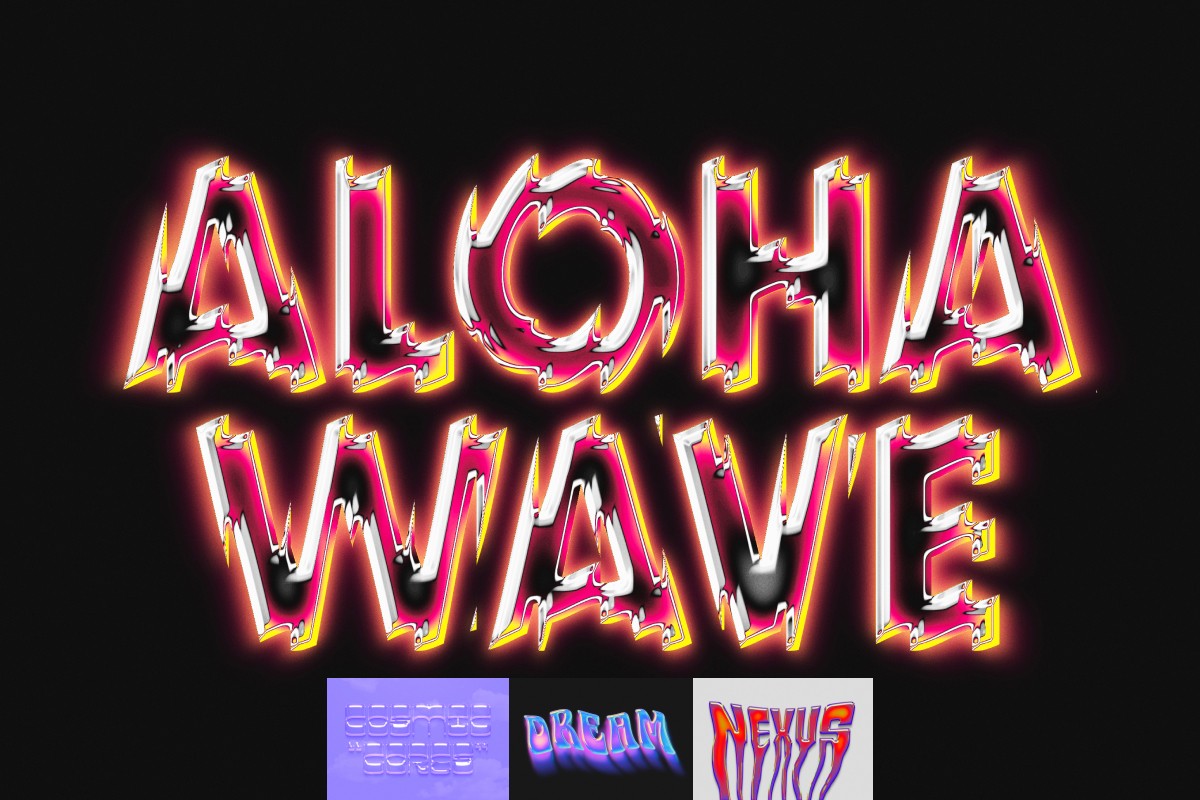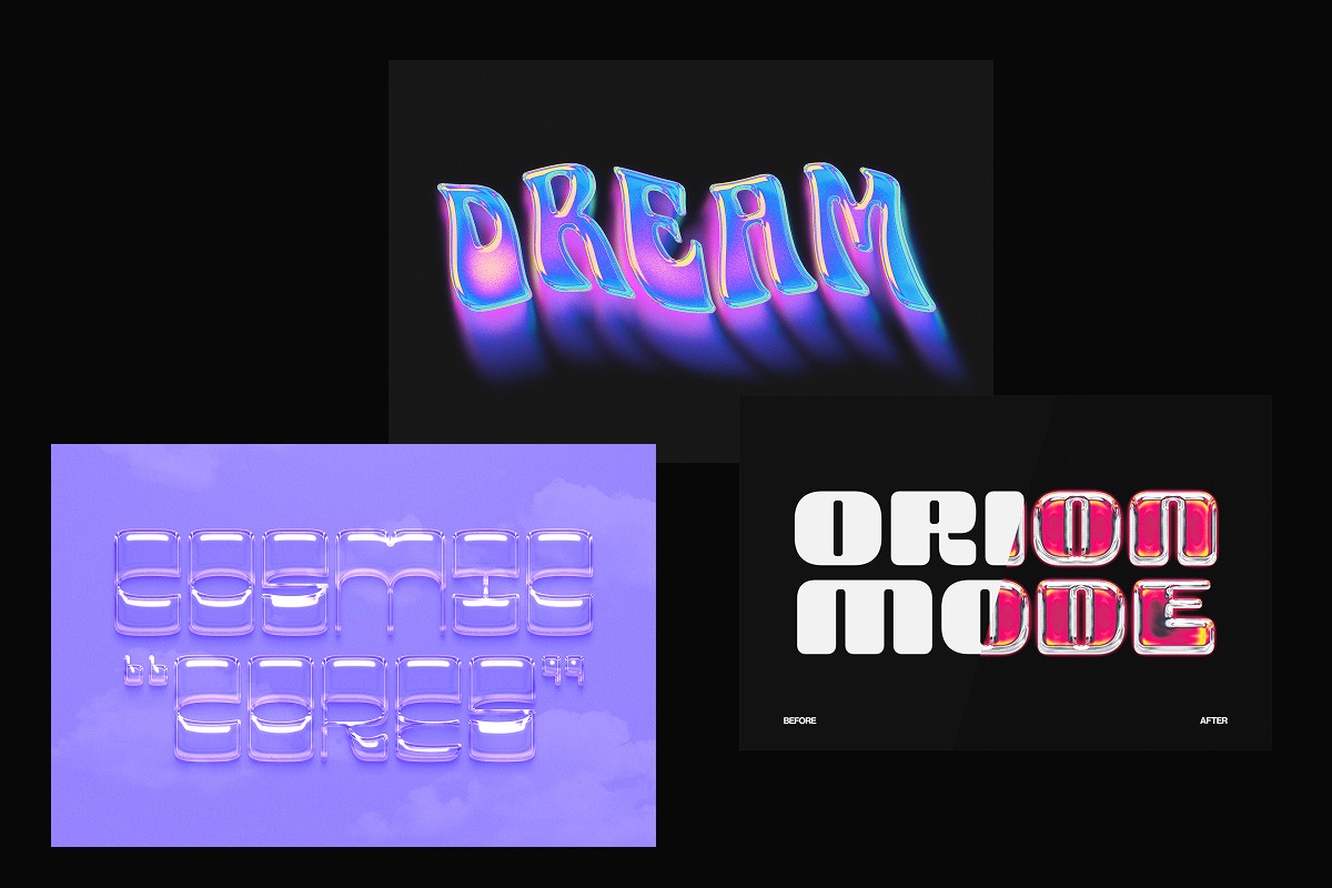 Liquid holographic text effects featuring glossy chrome textures, fluid shapes, and vibrant Y2K-inspired gradients. Designed to create eye-catching titles with dreamy, futuristic, and experimental visual styles.